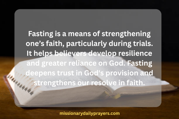 Fasting is a means of strengthening one’s faith, particularly during trials. It helps believers develop resilience and greater reliance on God. Fasting deepens trust in God’s provision and strengthens our resolve in faith.