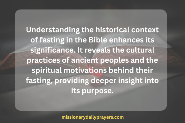 Understanding the historical context of fasting in the Bible enhances its significance. It reveals the cultural practices of ancient peoples and the spiritual motivations behind their fasting, providing deeper insight into its purpose.
