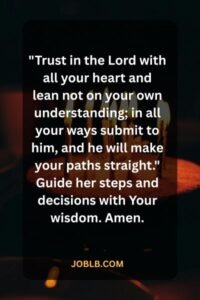 “Trust in the Lord with all your heart and lean not on your own understanding; in all your ways submit to him, and he will make your paths straight.” Guide her steps and decisions with Your wisdom. Amen.