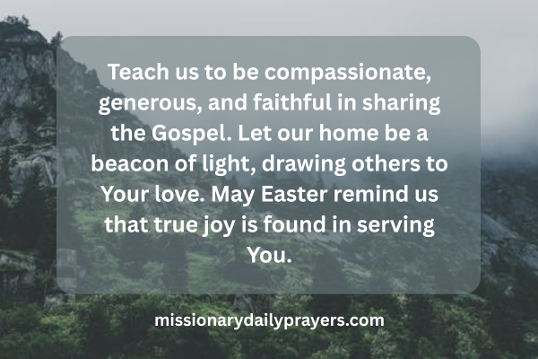 Teach us to be compassionate, generous, and faithful in sharing the Gospel. Let our home be a beacon of light, drawing others to Your love. May Easter remind us that true joy is found in serving You.