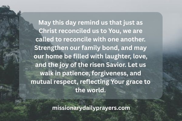 May this day remind us that just as Christ reconciled us to You, we are called to reconcile with one another. Strengthen our family bond, and may our home be filled with laughter, love, and the joy of the risen Savior. Let us walk in patience, forgiveness, and mutual respect, reflecting Your grace to the world.
