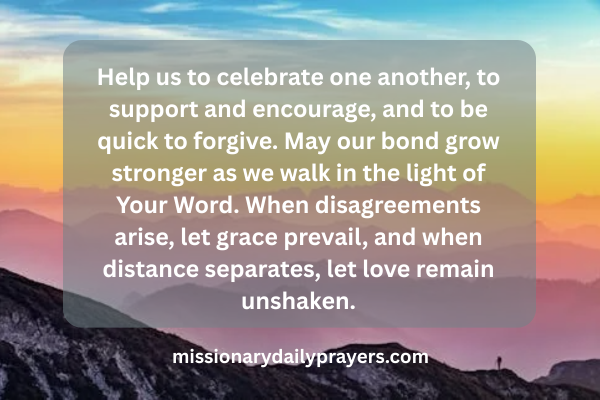 Help us to celebrate one another, to support and encourage, and to be quick to forgive. May our bond grow stronger as we walk in the light of Your Word. When disagreements arise, let grace prevail, and when distance separates, let love remain unshaken.