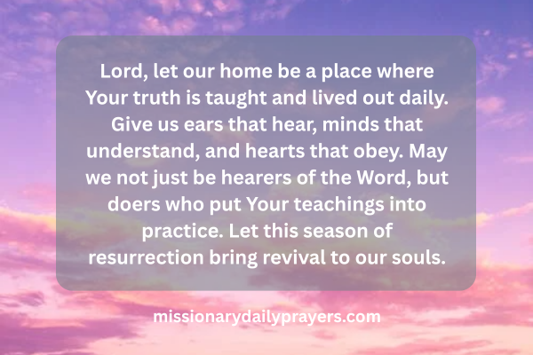 Lord, let our home be a place where Your truth is taught and lived out daily. Give us ears that hear, minds that understand, and hearts that obey. May we not just be hearers of the Word, but doers who put Your teachings into practice. Let this season of resurrection bring revival to our souls.