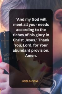 Lord, I come before You with a humble heart, asking for Your provision today. You know my needs and the desires of my heart. I trust in Your ability to provide for me and my loved ones. Open the doors of heaven and pour out Your blessings upon us. May we never lack anything good and may our needs be met according to Your riches in glory.