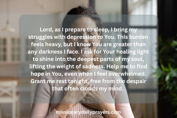 Lord, as I prepare to sleep, I bring my struggles with depression to You. This burden feels heavy, but I know You are greater than any darkness I face. I ask for Your healing light to shine into the deepest parts of my soul, lifting the weight of sadness. Help me to find hope in You, even when I feel overwhelmed. Grant me rest tonight, free from the despair that often clouds my mind. Fill my heart with Your love, and help me wake up with renewed strength. In Jesus’ name, Amen.