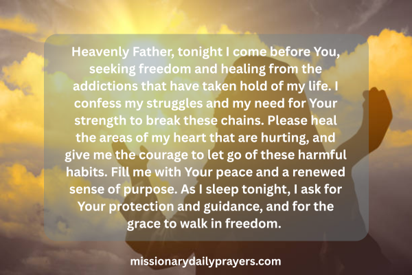 Heavenly Father, tonight I come before You, seeking freedom and healing from the addictions that have taken hold of my life. I confess my struggles and my need for Your strength to break these chains. Please heal the areas of my heart that are hurting, and give me the courage to let go of these harmful habits. Fill me with Your peace and a renewed sense of purpose. As I sleep tonight, I ask for Your protection and guidance, and for the grace to walk in freedom. Thank You for Your mercy and love. In Jesus’ name, Amen.