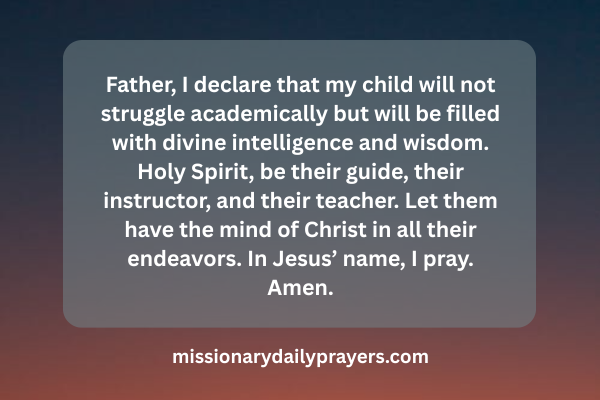 Father, I declare that my child will not struggle academically but will be filled with divine intelligence and wisdom. Holy Spirit, be their guide, their instructor, and their teacher. Let them have the mind of Christ in all their endeavors. In Jesus’ name, I pray. Amen.