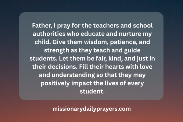 Father, I pray for the teachers and school authorities who educate and nurture my child. Give them wisdom, patience, and strength as they teach and guide students. Let them be fair, kind, and just in their decisions. Fill their hearts with love and understanding so that they may positively impact the lives of every student.