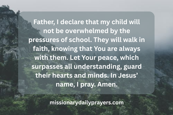 Father, I declare that my child will not be overwhelmed by the pressures of school. They will walk in faith, knowing that You are always with them. Let Your peace, which surpasses all understanding, guard their hearts and minds. In Jesus’ name, I pray. Amen.