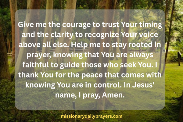 Give me the courage to trust Your timing and the clarity to recognize Your voice above all else. Help me to stay rooted in prayer, knowing that You are always faithful to guide those who seek You. I thank You for the peace that comes with knowing You are in control. In Jesus’ name, I pray, Amen.