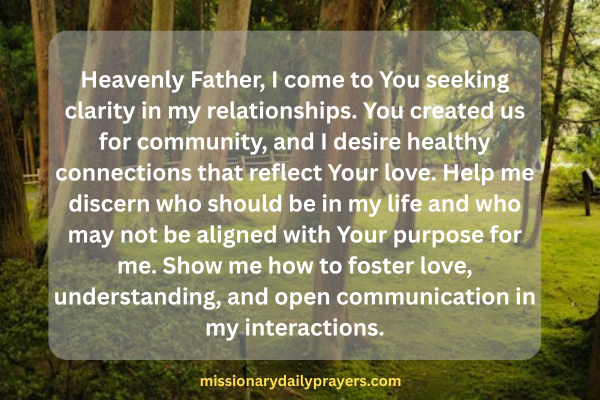 Heavenly Father, I come to You seeking clarity in my relationships. You created us for community, and I desire healthy connections that reflect Your love. Help me discern who should be in my life and who may not be aligned with Your purpose for me. Show me how to foster love, understanding, and open communication in my interactions.