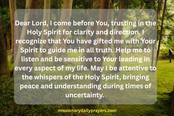 Dear Lord, I come before You, trusting in the Holy Spirit for clarity and direction. I recognize that You have gifted me with Your Spirit to guide me in all truth. Help me to listen and be sensitive to Your leading in every aspect of my life. May I be attentive to the whispers of the Holy Spirit, bringing peace and understanding during times of uncertainty. Grant me the faith to follow Your promptings, even when the path seems unclear. Thank You for Your promise to guide me through the Holy Spirit. I trust that as I seek You, I will find the clarity I need. In Jesus’ name, Amen.