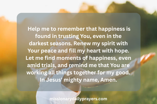 Loving Father, I seek Your peace in my heart and mind. In a world full of chaos and uncertainty, I long for the deep happiness that comes from knowing You. Fill my spirit with Your peace, which surpasses all understanding, and let that peace be the foundation of my happiness. When worries and fears threaten to steal my joy, remind me to turn to You in prayer. Let Your presence calm my heart and fill me with the happiness that only You can provide. Thank You for being my source of peace and joy. In Jesus’ name, Amen.