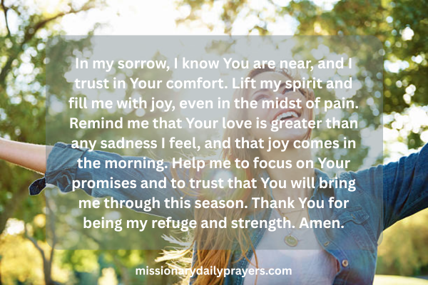 Dear God, I come before You with a heavy heart, seeking Your help to overcome the sadness that weighs me down. In my sorrow, I know You are near, and I trust in Your comfort. Lift my spirit and fill me with joy, even in the midst of pain. Remind me that Your love is greater than any sadness I feel, and that joy comes in the morning. Help me to focus on Your promises and to trust that You will bring me through this season. Thank You for being my refuge and strength. Amen.