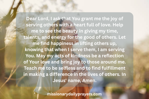 Dear Lord, I ask that You grant me the joy of serving others with a heart full of love. Help me to see the beauty in giving my time, talents, and energy for the good of others. Let me find happiness in lifting others up, knowing that when I serve them, I am serving You. May my acts of kindness be a reflection of Your love and bring joy to those around me. Teach me to be selfless and to find fulfillment in making a difference in the lives of others. In Jesus’ name, Amen.