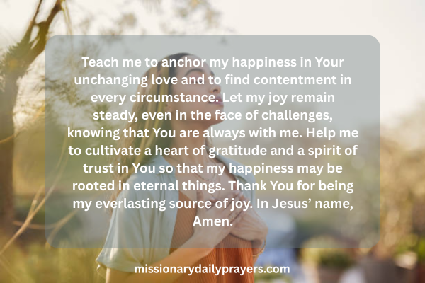 Dear Lord, I pray for a happiness that lasts. Not the fleeting emotions of the world but the deep, enduring joy that only comes from You. Teach me to anchor my happiness in Your unchanging love and to find contentment in every circumstance. Let my joy remain steady, even in the face of challenges, knowing that You are always with me. Help me to cultivate a heart of gratitude and a spirit of trust in You so that my happiness may be rooted in eternal things. Thank You for being my everlasting source of joy. In Jesus’ name, Amen.