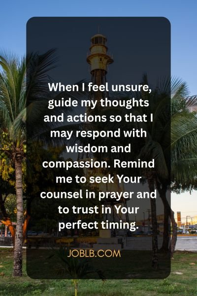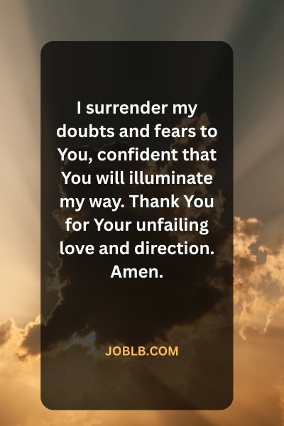 Dear Heavenly Father, I come before You, seeking Your wisdom and guidance in the choices I face. Help me to discern Your will and to trust in Your perfect plan for my life. In moments of uncertainty, remind me to pause and listen for Your voice. May Your Spirit lead me on the right path, granting me the clarity to see the options before me. I surrender my doubts and fears to You, confident that You will illuminate my way. Thank You for Your unfailing love and direction. Amen.