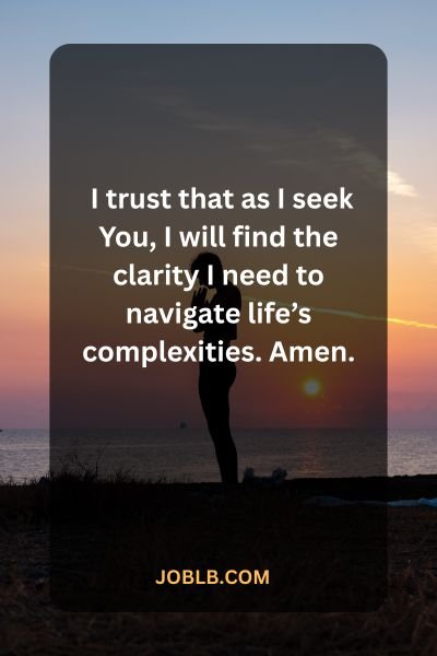 Dear Compassionate Savior, as I seek clarity in my life, I turn to You in prayer. Help me to quiet my mind and listen to Your gentle voice guiding me. Amid the chaos, grant me peace and focus. Let Your wisdom fill my heart, allowing me to see the truth in every situation. May my prayers draw me closer to You, unveiling the path You desire for me. I trust that as I seek You, I will find the clarity I need to navigate life’s complexities. Amen.