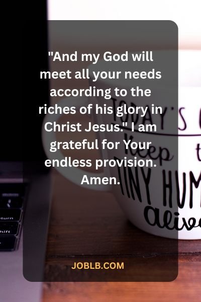 Lord, I bring my financial needs before You today. I trust in Your provision and ask for Your blessings in my financial affairs. Help me to manage my resources wisely and to use them for Your Kingdom. Provide for my needs and bless me with abundance according to Your will.